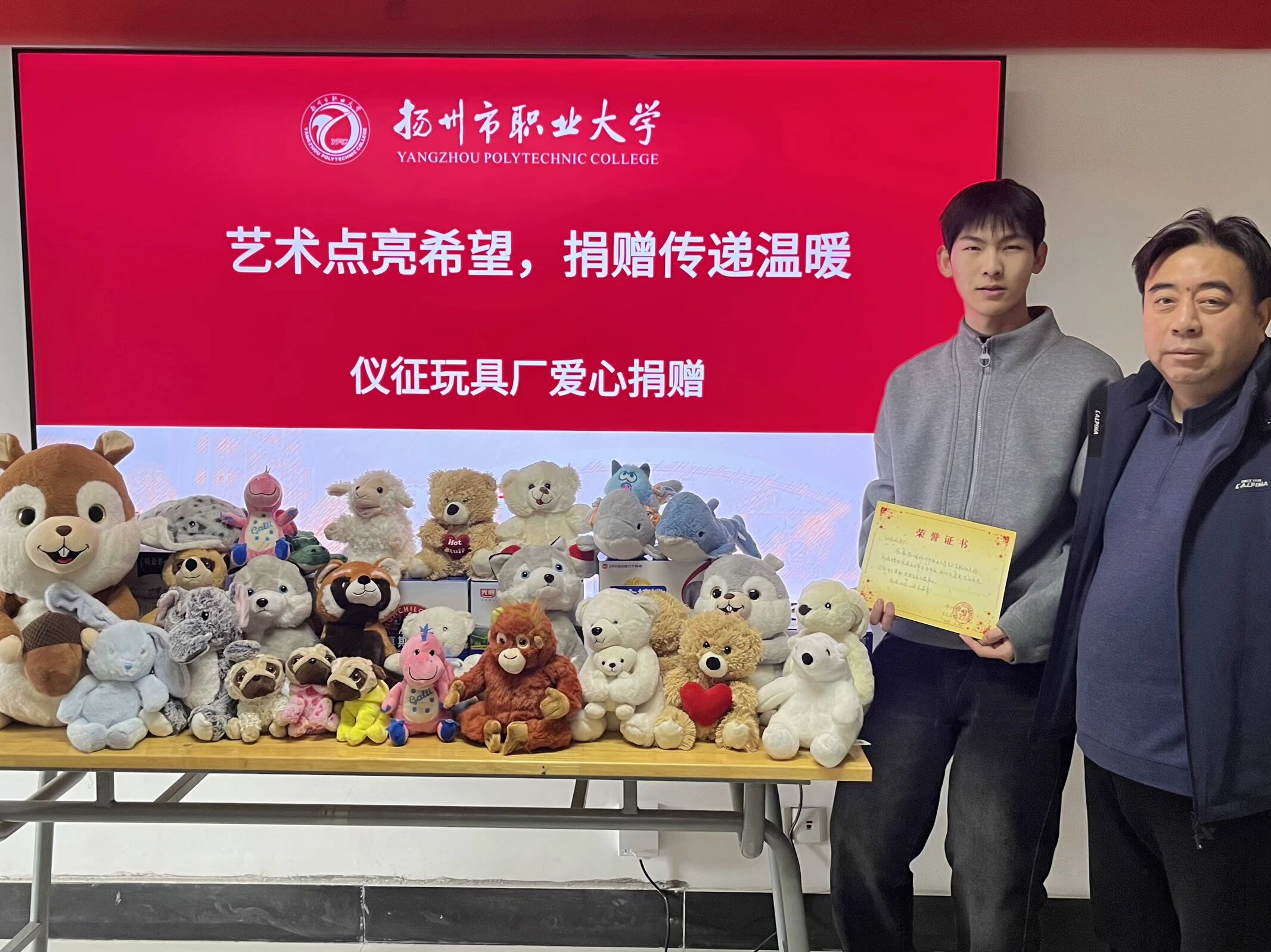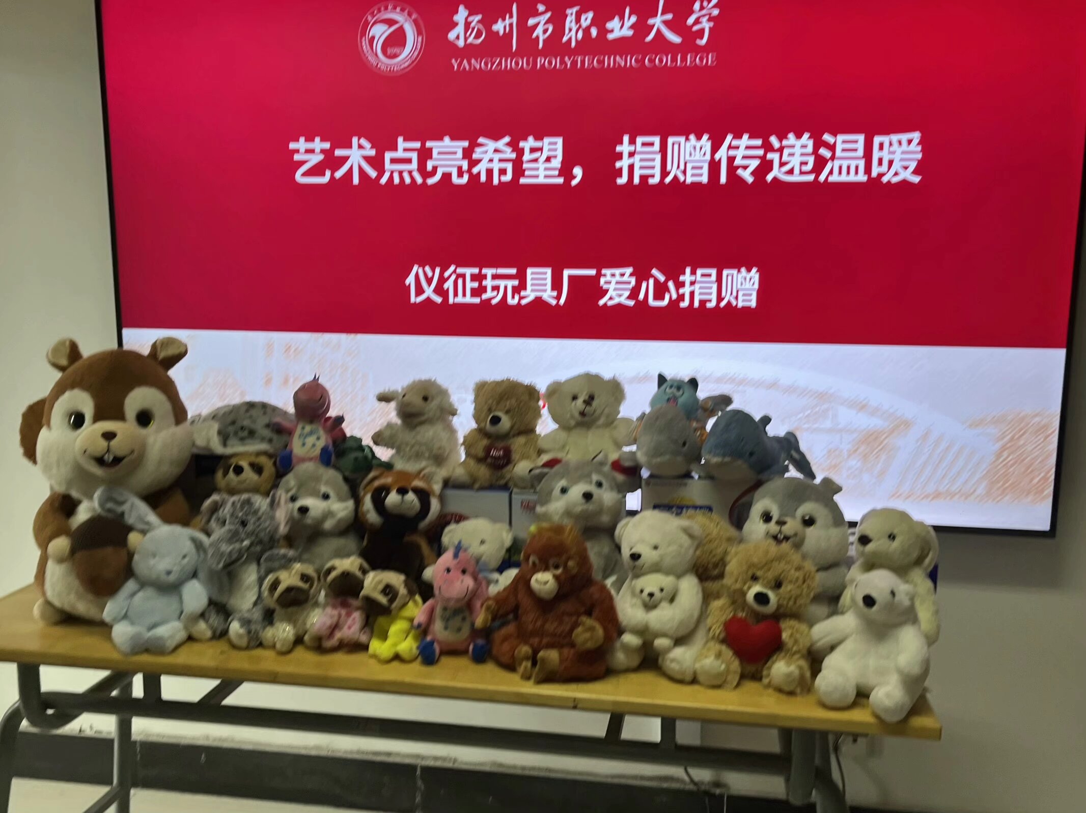 2025年4月18日,一场充满温情的爱心捐赠仪式在扬州职业技术大学艺术学院举行。仪征市知名儿童用品企业——“童趣时光”玩具厂向学院家庭经济困难学生捐赠300只高品质毛绒玩具,以实际行动践行社会责任,传递社会关爱。艺术学院党总支书记毛益民、学工办全体辅导员、“红艺志愿团”学生代表及受助学生共同参加活动。
