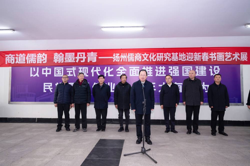 马顺圣宣布扬州儒商文化研究基地迎新春书画艺术展开幕。