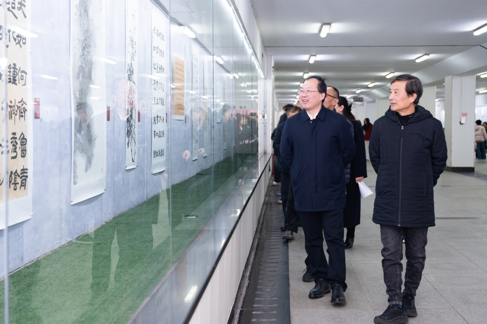 1月8日下午,商道儒韵 翰墨丹青——扬州儒商文化研究基地迎新春书画艺术展开幕式在瘦西湖校区举行。校党委书记马顺圣,扬州市儒商研究会会长刘俊,常务副会长兼秘书长吴忠俊,儒商书画院院长范钦华、常务副院长杨斌及部分书画家代表,校党委副书记陈亚鸿,党委委员、副校长吴书安、花军及学校相关部门负责人、艺术学院师生代表参加活动。