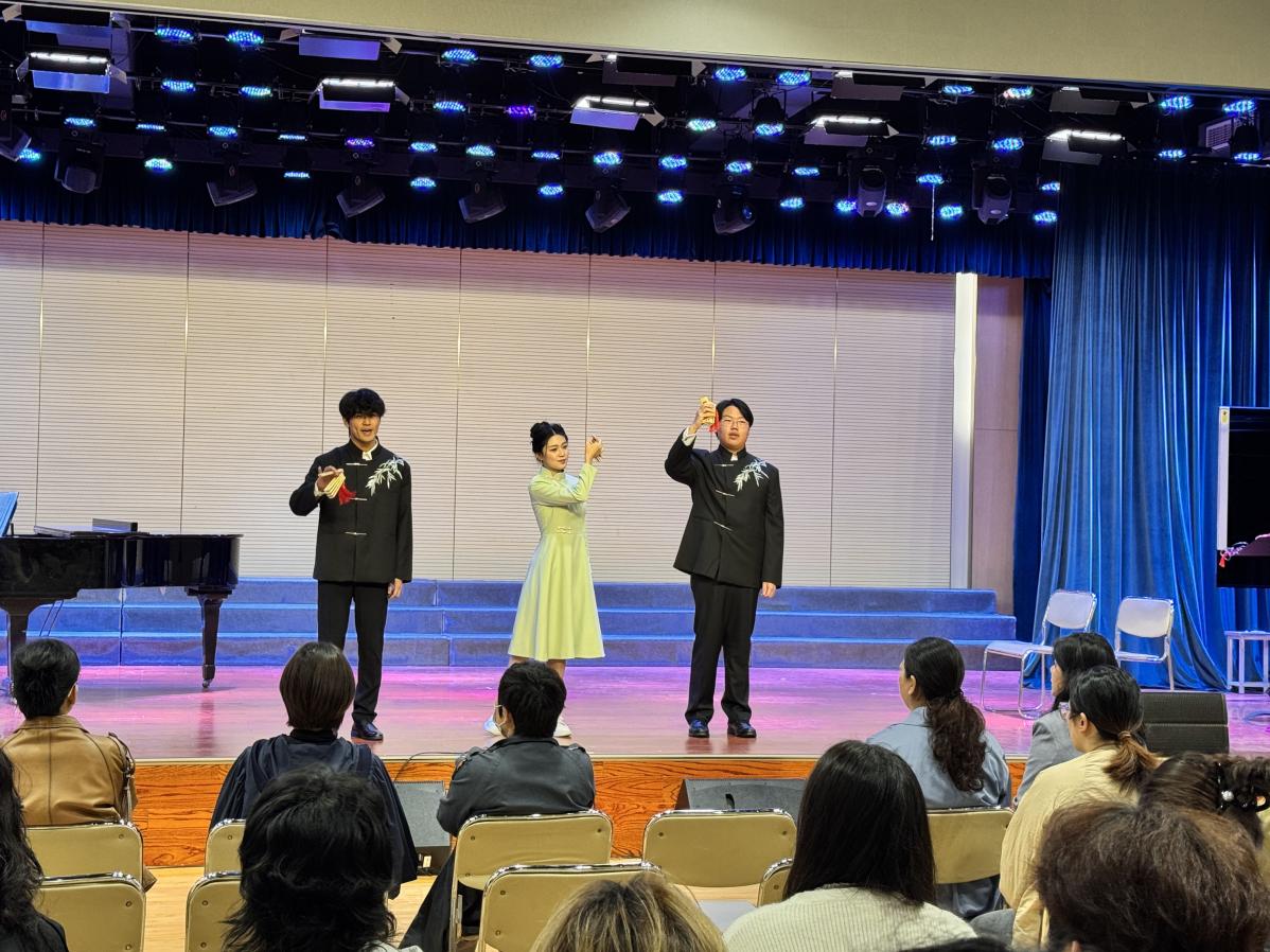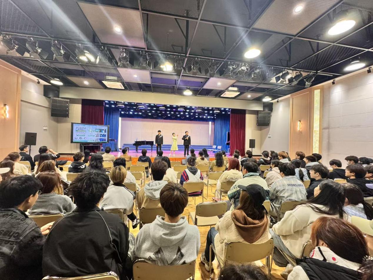 汇报演出环节,三位参赛同学分别进行个人专业技能展示,充分展现各自扎实的专业功底与良好的舞台表现力。随后,以“湖村新‘声’代——音乐赋能乡村文化振兴”为题展示团体项目。该项目是由我校师生团队提前深入本地湖村开展采风实践,将古老渔歌元素与乡村振兴新面貌有机结合,创新采用多声部合唱、民乐改编等表现形式,实现本土传统文化的现代化重构,既彰显了师生的团队协作能力,也体现了大家的文化创新意识。